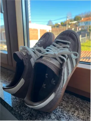 Zapatillas Adidas Handball Spezial en color marrón y blanco. Talla 38.5. - Diseño clásico. - Detalles de las tres rayas. - Suela de goma.