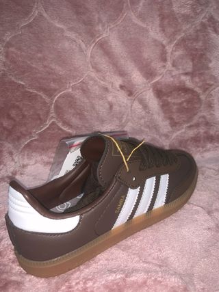 Zapatillas Adidas Samba OG en color marrón con detalles blancos. Un clásico atemporal. sin estrenar con caja original talla 38 - Diseño icónico. - Suela de goma. - Cordones marrones.
