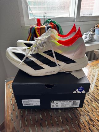 Zapatillas de running Adidas Adizero Adios Pro 4 en talla 46. Diseñadas para ofrecer máximo rendimiento en competición. Sólo usadas para probarlas en una media maratón (30-35km aprox). excelente rendimiento - Modelo: Adizero Adios Pro 4 - Talla: 46 - Color: Blanco, negro y detalles en rojo y amarillo neón.