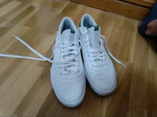 Zapatillas Adidas Stan Smith en talla 41 1/3. - Diseño clásico. - Detalle en color verde en el talón. - Cordones blancos. No se venden en la caja porque vino dañada