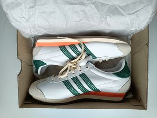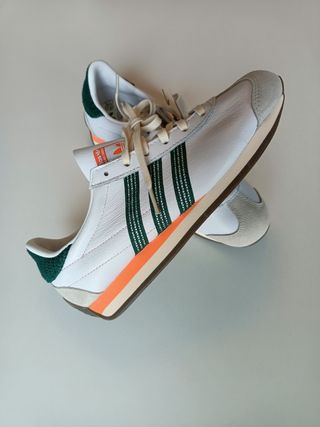 Zapatillas deportivas Adidas modelo Country OG para mujer con un diseño moderno y llamativo. -Nuevas en su caja, sin estrenar. - Exterior de piel. - Combinación de blanco, verde y detalles naranjas. - Materiales de calidad para mayor comodidad. - Estilo retro con las icónicas tres rayas.