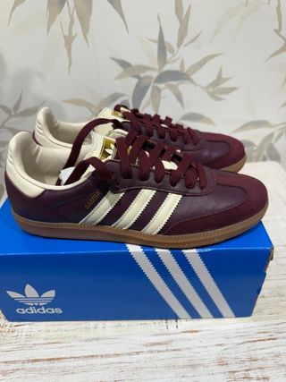 Zapatillas Adidas Samba en color granate y blanco. El diseño clásico de estas zapatillas las hace perfectas para cualquier ocasión. - Parte superior de cuero. - Suela de goma. - Detalle de las tres rayas icónicas de Adidas.