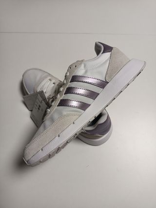 Zapatillas deportivas Adidas blancas, sin estrenar. - Diseño con tres franjas rojas. - Cierre de cordones. - Detalle de logo en la lengüeta y el talón.