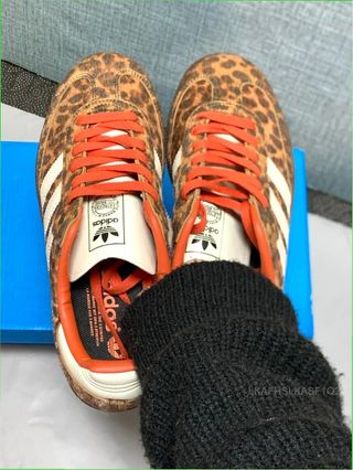 Zapatillas Adidas Samba OG con un llamativo estampado de leopardo. - Diseño con detalles en naranja. - Tres rayas blancas icónicas de Adidas.