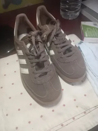 Zapatillas Adidas Samba originales en color marrón. Se encuentran en excelente estado, prácticamente nuevas. - Diseño clásico con las tres franjas blancas. - Suela de goma marrón. - Material de ante.