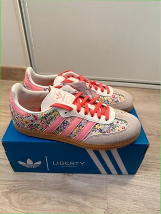 Zapatillas Adidas Samba con un diseño floral exclusivo de Liberty London. - Parte superior de ante y tela con estampado floral. - Detalles en rosa y blanco. - Cordones de color coral. - Suela de goma. - Talla 37.