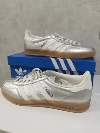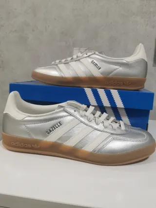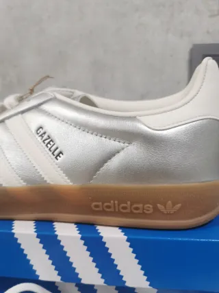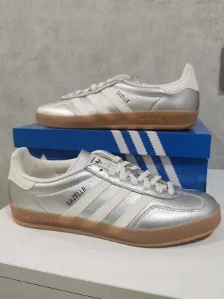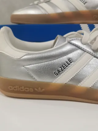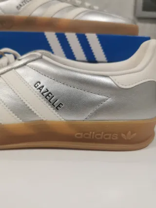Zapatillas Adidas Gazelle en color plata y blanco. Diseño clásico con detalles icónicos. - Tres rayas laterales en blanco. - Detalle de Gazelle en el lateral. - Suela de goma marrón. - Logo de Adidas en la lengüeta y el talón.