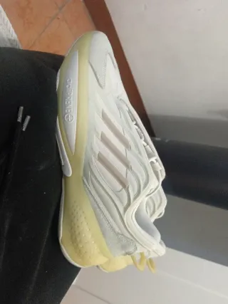 Zapatillas deportivas Adidas en color blanco, perfectas para correr o para el día a día. Diseño ligero y cómodo. - Parte superior de malla transpirable. - Tres rayas laterales icónicas. - Cierre con cordones. - Tienen cierta coloración en la puntera como se ve en la última foto, por haber sido usadas al aire libre