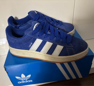 Zapatillas Adidas modelo Campus en color azul y blanco. Poco uso. - Diseño clásico con las tres rayas. - Detalle CAMPUS en el lateral. - Suela de goma. - Cordones azules.