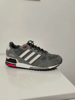 Zapatillas deportivas Adidas ZX 750. - Diseño en color gris con detalles en rojo. - Tres franjas blancas características de la marca.