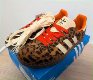Zapatillas Adidas Samba OG W con un llamativo estampado de leopardo. Edición limitada. - Diseño exclusivo. - Cordones naranjas y beige incluidos. - Detalle de las tres rayas blancas.
