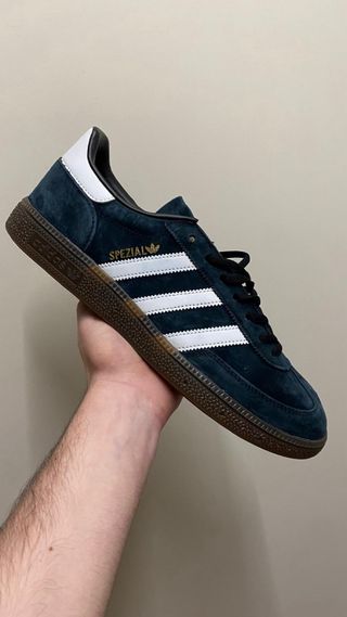 Zapatillas deportivas Adidas Spezial en color azul marino con detalles blancos. - Diseño clásico. - Tres rayas laterales. - Logo de Adidas y Spezial en dorado.