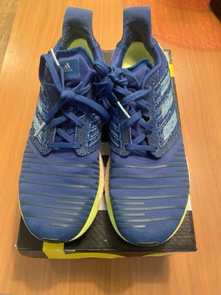 Zapatillas deportivas Adidas Solar Boost M. - Color azul con detalles en amarillo. - Talla 9 (equivalente a 42 EU).