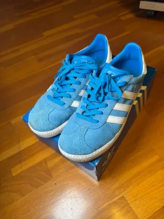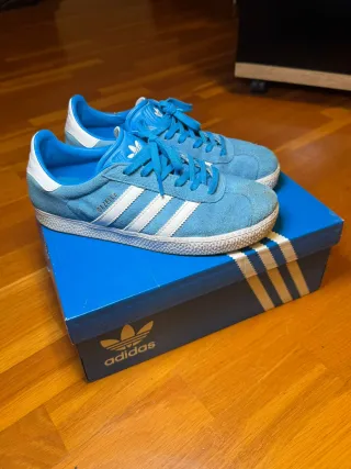 Adidas Gazelle originales Zapatillas Adidas Gazelle en color azul con detalles en verde. Fabricadas en ante, muy cómodas y ligeras. Estado muy bueno, poco uso, sin roturas ni desperfectos importantes (ver fotos reales). Modelo clásico y atemporal, ideales para uso diario o vestir casual.