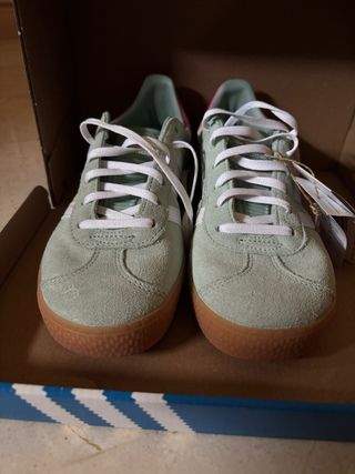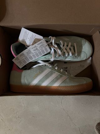 Adidas Gazelle sin estrenar con etiquetas, color: hazy green/footwear white/bliss pink. Suela de goma cosida. Talla 38. Horma clásica Cierre de cordones Empeine de ante Forro sintético Plantilla OrthoLite®