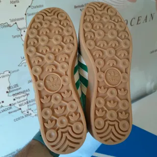 Zapatillas Adidas Gazelle en color verde. Regalo Comprado en casa adidas no son replicas que se ven por ahí, una sola puesta en ruenion por casa, pero al final me di cuenta que era una talla mas de la que uso, lo quise cambiar pero se dieron cuenta por la suela que estaba usada. - Diseño clásico de tres rayas blancas. - Suela de goma. - Material de ante.