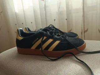 Zapatillas Adidas Gazelle con un diseño clásico y llamativo. La talla es 39 1/3. Están un poco desgastadas por dentro (ver foto) pero no es exagerado. Muy poco usadas. - Combinación de colores negro y amarillo. - Detalle de las icónicas tres rayas.