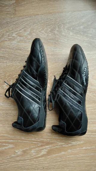 Zapatillas Adidas Goodyear, talla 42. Son de color negro con la suela blanca y detalles azules y rojos. Están en muy buen estado, usadas una vez. - Fabricadas en piel. - Suela Goodyear.