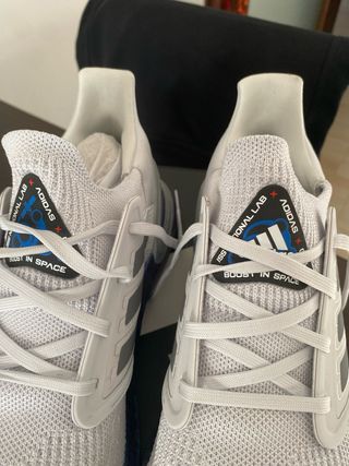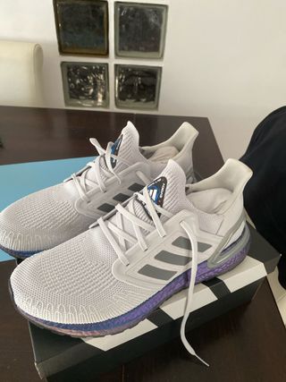 Zapatillas Adidas Ultraboost en tonos grises con detalles morados en la suela. - Diseño moderno y deportivo. - Tejido transpirable. - Suela con amortiguación Boost. se an usado dos veces para andar y mis pies son ancho para este tipo de zapatillas estan nuevas prefiero en mano para ver si estado que es impoluto conservo la caja original