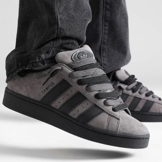 Zapatillas Adidas Campus en tonos grises y negros. - Exterior de ante. - Detalle de las tres bandas. - Cordones negros.