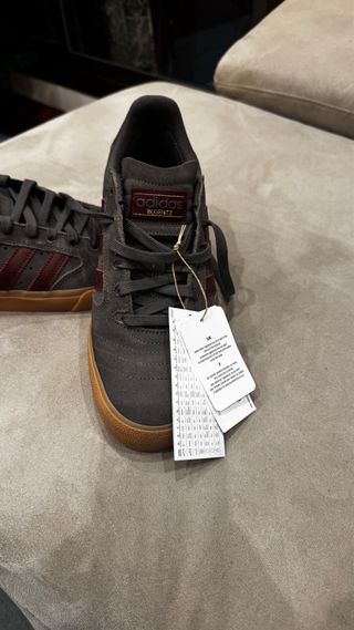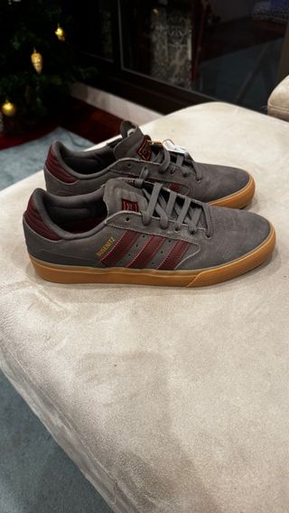 Zapatillas Adidas Busenitz Vulc II en ante gris con detalles burdeos y suela de goma. - Diseño clásico de skate. - Tres rayas icónicas de Adidas en los laterales. - Detalle BUSENITZ en dorado.
