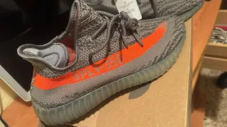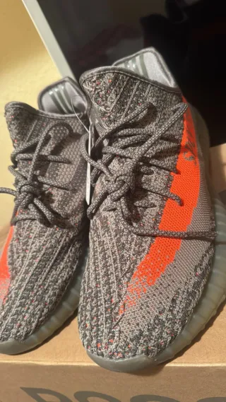 Zapatillas Adidas Yeezy Boost 350 V2 con un diseño moderno. - Tejido Primeknit en gris y detalles naranjas. - Cordones grises. - Suela semitransparente. - Talla: 43.5