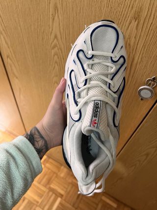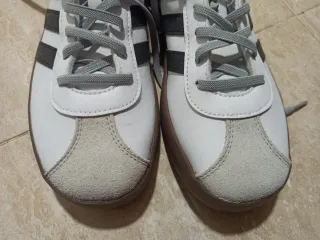 Zapatillas deportivas Adidas en perfecto estado. - Diseño moderno con detalles en azul. - Combinación de blanco y gris en el exterior. - Suela de goma resistente.