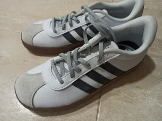 Zapatillas deportivas Adidas en tonos blancos y grises. Perfectas para el día a día. - Diseño moderno y ligero. - Cierre con cordones. - Detalle de las tres bandas. - Suela de goma. Costaron 70 , pero me equivoqué de número y me pasó el plazo de devolución Incluyen la caja