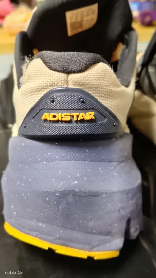 Zapatillas deportivas Adidas con un diseño moderno y llamativo. - Combinación de colores negro y azul. - Detalles en amarillo y gris. - Suela de goma. - Cierre de cordones.modelo adistar suela continental