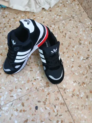 Zapatillas deportivas Adidas ZX 750. - Diseño clásico en negro y blanco. - Detalles en rojo y gris en la suela. - Logo de Adidas en la lengüeta y el talón.