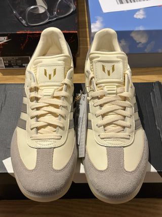 Zapatillas Adidas Samba edición especial Messi. Un diseño icónico con un toque moderno. - Parte superior de ante y cuero. - Detalle del logo de Messi en la lengüeta. - Tres rayas características de Adidas en los laterales.