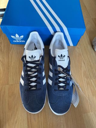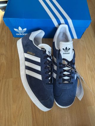 Zapatillas Adidas Gazelle de ante azul marino con detalles blancos. - Diseño clásico. - Tres rayas blancas laterales. - Suela de goma blanca.