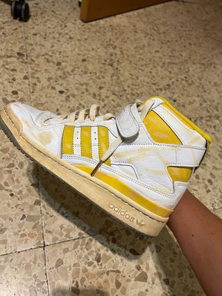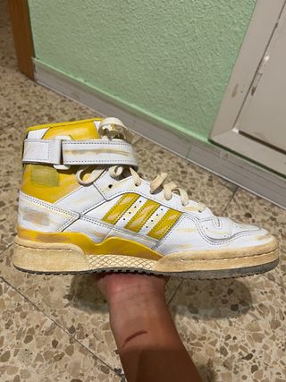 Zapatillas altas Adidas Forum 84 High en un llamativo diseño Vintage Yellow. original - Combinación de blanco y amarillo. - Cierre de velcro en el tobillo. - Tres rayas icónicas de Adidas en los laterales. sin caja Solo se usaron dos veces, se ven viejas, es por el diseño.