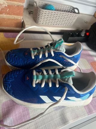 Zapatillas de pádel de la marca Adidas, con un partido. - Color azul con detalles en blanco y turquesa. - Diseño deportivo y moderno. Vendo zapatillas de padel/tenis ya que me quedan grandes, probadas un partido y sin posibilidad de devolución a la tienda por pasarme la fecha máxima. PVP 120 euros.
