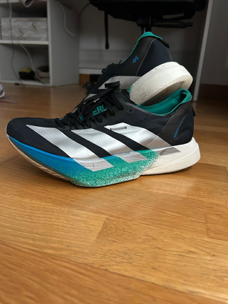 Zapatillas de running Adidas Adizero Adios Pro 4, en excelente estado, con un solo uso. - Diseño moderno con detalles plateados, verdes y azules. - Parte superior de malla transpirable. - Suela de espuma para una amortiguación reactiva.