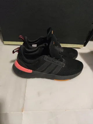 Zapatillas deportivas Adidas en color negro con detalles blancos. - Diseño moderno y deportivo. - Cierre con cordones. - Logo de Adidas en los laterales y la lengüeta. Sólo me las he puesto una vez. Tengo un juanete y me molesta cantidubi. Nuevas valen 49.99. Están perfectas. Maldito juanete. Y el trauma dice que no me opera.
