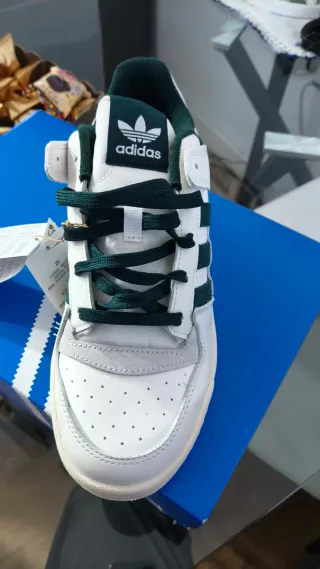 Zapatillas Adidas Forum Low CL en blanco y verde, sin estrenar. - Diseño clásico de caña baja. - Detalles de las tres rayas icónicas. - Cierre con cordones. Se vende por fallo de talla, no es la mía.
