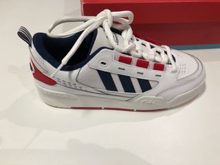 Zapatillas deportivas Adidas originales con un diseño moderno y cómodo. - Combinación de blanco y azul. - Detalle de las tres franjas laterales. - Cierre con cordones. - Corte bajo (low). - Diseño inspirado en zapatillas de baloncesto clásicas. - Talón con panel azul marino y logo Adidas. - Suela de goma con patrón en espiga.