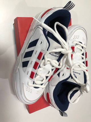 Zapatillas deportivas Adidas con un diseño moderno y detalles en rojo, blanco y azul. - Parte superior de ante. - Tres rayas laterales características de la marca. - Cierre con cordones blancos.