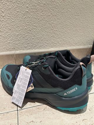 Zapatillas de senderismo Adidas Terrex Skychaser AX5 con tecnología Gore-Tex. Tengo tallas 42 2/3 44 2/3 44 43 1/3 - Color principal negro con detalles en verde azulado. - Diseño robusto para terrenos difíciles. - Cierre con cordones para un ajuste seguro.