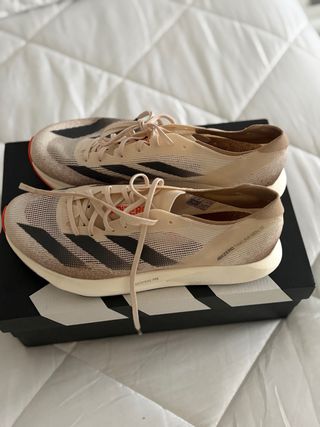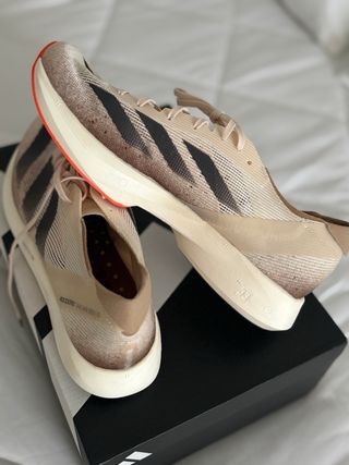 Zapatillas de running Adidas Adizero Prime X en llamativos tonos naranja y blanco. Diseñadas para ofrecer un rendimiento superior. - Modelo: Adizero Prime X - Color: Naranja y blanco - Marca: Adidas Las vendo porque no son mi número y me están grandes. Fueron un regalo y no puedo cambiarlas pero están sin estrenar