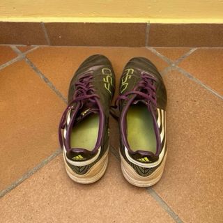 Zapatillas con tacos triangulares especiales para césped artificial. Poco uso, no tienen los típicos desgastes en los talones. Son un 46, pero yo normalmente uso un 45 y me van bien, diría que tallan pequeño.