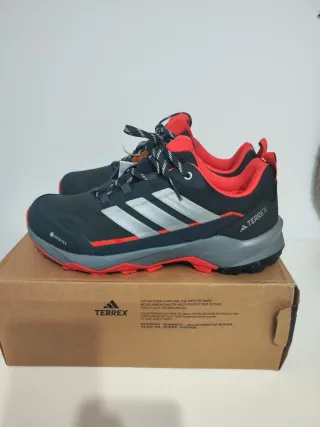 Zapatillas de trekking Adidas Terrex con tecnología Gore-Tex. - Color negro y rojo. - Suela de goma. - Cierre de cordones.