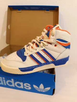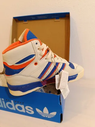 Zapatilla alta Adidas Attitude con un diseño llamativo. - Combinación de colores blanco, azul y naranja. - Detalle de las tres rayas de Adidas en los laterales.