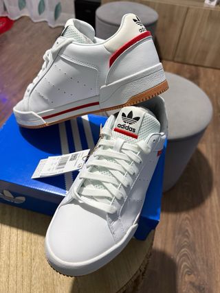 Zapatillas deportivas Adidas Court Tourino para hombre. - Diseño clásico en color blanco con detalles en rojo. - Suela de goma con acabado en marrón. - Cierre de cordones.