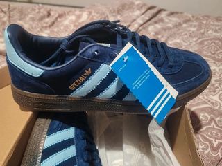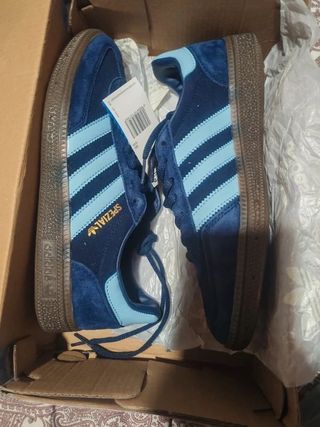 Zapatillas Adidas en talla 40.5. Un diseño clásico con detalles en azul claro. - Parte superior de ante y material sintético. - Tres rayas características de Adidas. - Suela de goma. - Detalle Spezial en el lateral.