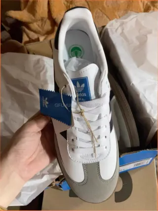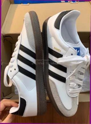 Zapatillas Adidas Samba OG, un clásico del diseño deportivo. - Diseño icónico europeo. - Combinación de blanco y negro. - Suela de goma marrón.