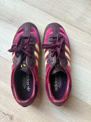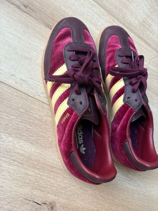 Zapatillas Adidas Samba, usadas solo una vez. El material exterior es de terciopelo en color morado, con detalles en cuero burdeos y las icónicas tres franjas en color dorado. - Exterior de terciopelo. - Detalles en cuero. - Tres franjas doradas.
