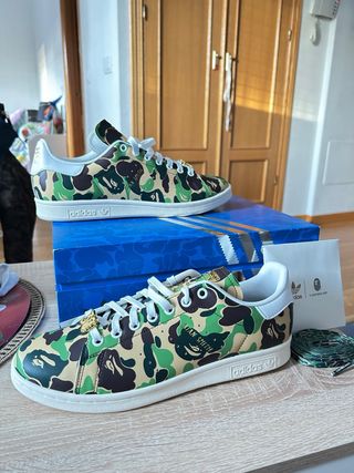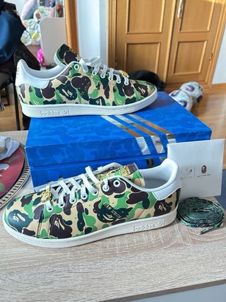 Zapatillas Adidas Stan Smith con un diseño único de BAPE. - Estampado de camuflaje característico. - Detalles en blanco y verde. - Cordones blancos.