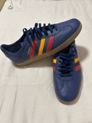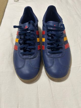 Zapatillas deportivas Adidas con diseño inspirado en la bandera de España. - Color principal azul. - Detalles en rojo y amarillo. - Suela de goma. - Cordones azules.